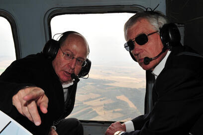 Ya'alon (L) and Hagel fly over Golan Heights last month (Photo: Ariel Hermoni)
