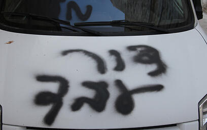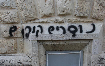 The inscriptions, reading "Jesus, son of a…" and "price tag," were tagged with blue paint on the church's gate. A month earlier, the door of the Latrun Monastery was torched.