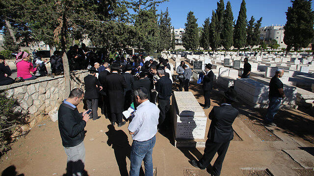 While many mourners arrived at the shiva at the home of Rabbi Yosef ,many followers arrived Tuesday morning at his grave in the Sanhedria cemetery. From the early hours of the morning, hundreds of worshippers seeking to honor the rabbi's memory visited the grave.