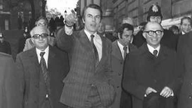 Kadishai, UK FM Owen, Begin, 1977 (Photo: Sa'ar Yaakov, GPO)