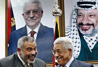 Haniyeh, Abbas share laugh. Archive (Photo: Reuters)
