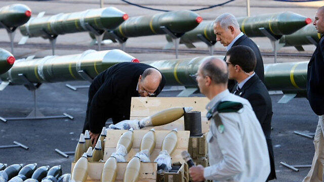 Prime Minister and Defense Minister examine weapons seized from the Iranian ship. (Photo: Motti Kimchi)