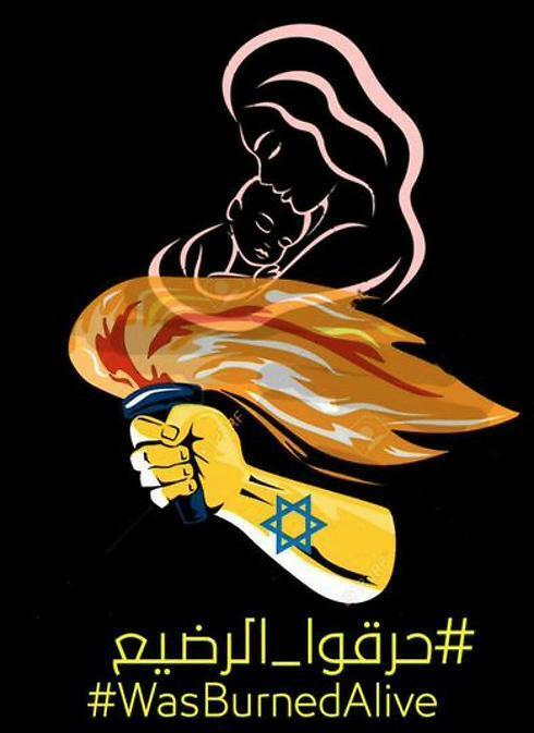 Images using hashtags that blamed Israel for the attack began circulating online on Friday. One read in Arabic: "Oh Zionists! The anger of the West Bank is on its way! The child Ali Dawabsheh #Angry Friday #They burned the suckling", with another using the last hashtag as well as the hashtag "#WasBurnedAlive" in English.