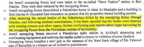 Meanwhile, the Palestinian Authority representative at the United Nations claimed that other bodies which had been transferred to them "were returned with organs missing, after the occupying forces harvested organs from the Palestinian victims."
