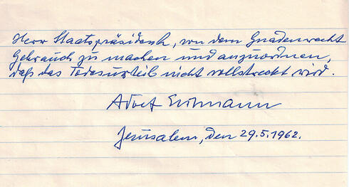 The war criminal, who was among those most involved in carrying out the Holocaust, further wrote: "I also never gave any orders in my name, but always operated according to orders. Had I been, as the judges assume, the fanatical driving force in the persecution of the Jews, this should have been reflected in a promotion and other rewards, but I was never granted any benefit. A line must be drawn between the leaders who are responsible and people like me, who were forced to be tools by the leadership. I was not in charge of things, and therefore I do not feel that I am guilty. And I ask of you, honorable president, to use your right of pardon and order that this death sentence not be carried out."