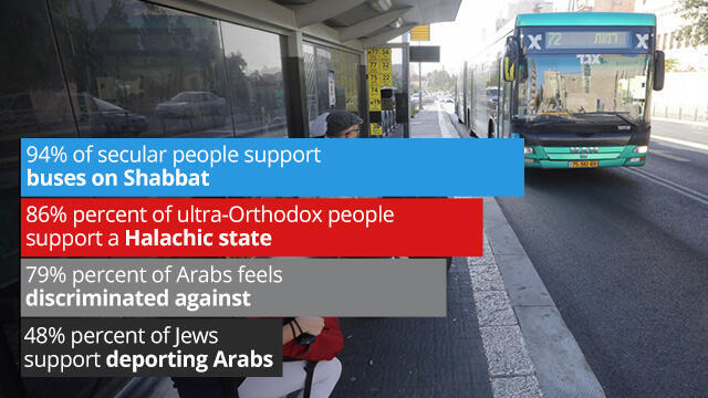 For example, a clear majority of ultra-Orthodox and religious Jews say public transportation should stop on Shabbat, while 94 percent of secular Jews oppose this. Traditional Jews are split, with 44 percent supporting the position and 52 percent who think certain transportation options should be available in at least some places.