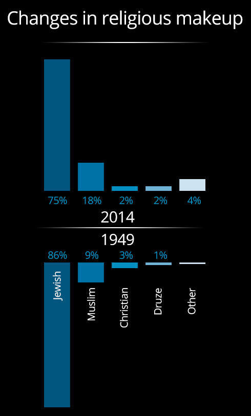 In comparison, the first census in Israel, conducted in 1949, showed that 86 percent of the population was Jewish, nine percent was Muslim, three percent was Christian and one percent was Druze. But in 2014, only 75 percent of the population was Jewish, while the rate of Muslims in the population doubled to 18 percent, and the rate of Christians dropped to two percent.