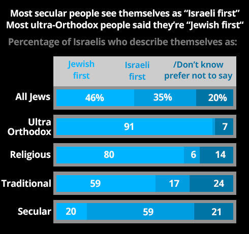 Most secular Jews in Israel say they see themselves as Israeli first and only then as Jews, while most Orthodox Jews say they see themselves as Jewish first and Israeli second.