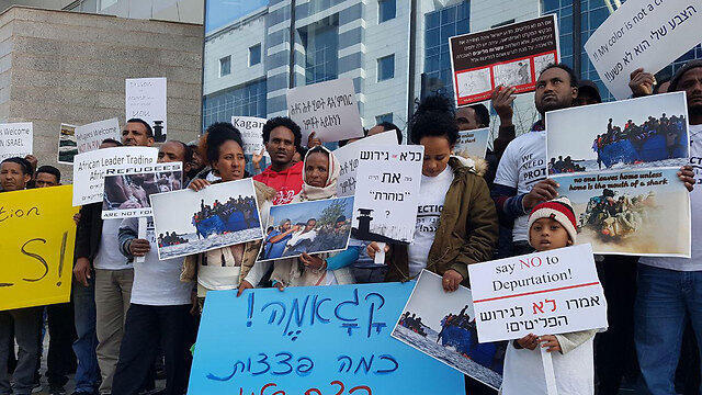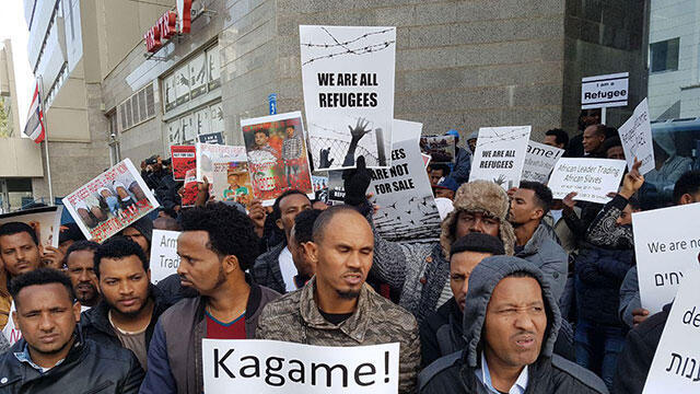 Thousands of asylum seekers, Israelis protest Israel's intent to forcefully deport migrants outside Rwandan embassy; 'We don't want to be sold off as slaves,' says one migrant; several El Al pilots sign petition refusing to fly migrants against their will; 'I cannot take part in flying refugees to a destination where their chances of survival are nil,' says one pilot; El Al denies such a request was made.