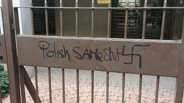 At the Polish embassy in Tel Aviv on Sunday, swastikas and anti-Polish profanities were found drawn in marker pen on a gate and bulletin board. Police, who released photographs of the markings, opened an investigation.
