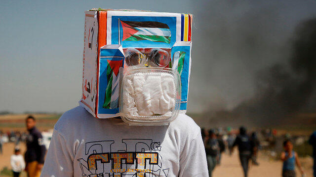 Muna a-Shaer, 43, of Khan Yunis gave out improvised gasmasks to protesters to help them defend themselves against Israeli tear gas. "We're here for our future," he told AFP. "Israelis are cowards."