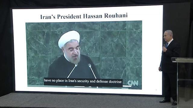 The prime minister, who delivered the speech in both English and Hebrew, began by presenting his listeners with three separate excerpts from past speeches by Iran's Supreme Leader of Iran Ali Khamenei, President Hassan Rouhani and Foreign Minister Mohammad Javad Zarif in which the three denied in international forum any intentions to obtain a nuclear weapon.