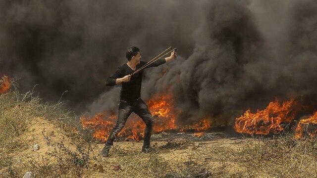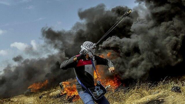 Palestinian rioter armed with slingshot aiming at a nearby hovering drone