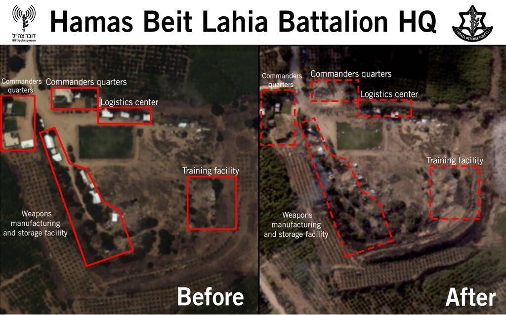 Aerial photos released by the IDF on Sunday morning show the results of the attack on the Hamas battalion headquarters in Beit Lahiya in the northern Gaza Strip, which included offices, war rooms, storage areas, and an urban warfare training facility.