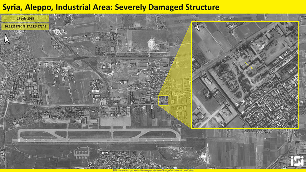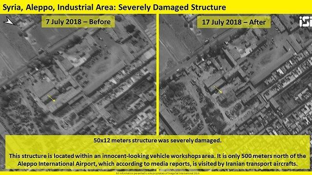 Satellite images taken by the Israeli satellite company ImageSat show the destruction of a building that was attacked earlier this week near the Aleppo International Airport in Syria, some 350 kilometers from the border with Israel.