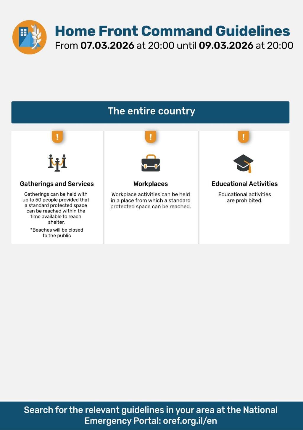 Under the directives, which apply to the entire country, workplaces may operate only if employees can reach a standard protected space within the required time during an alert. Gatherings are limited to up to 50 people, provided a protected space is accessible. Educational activities remain prohibited, and beaches are closed to the public.