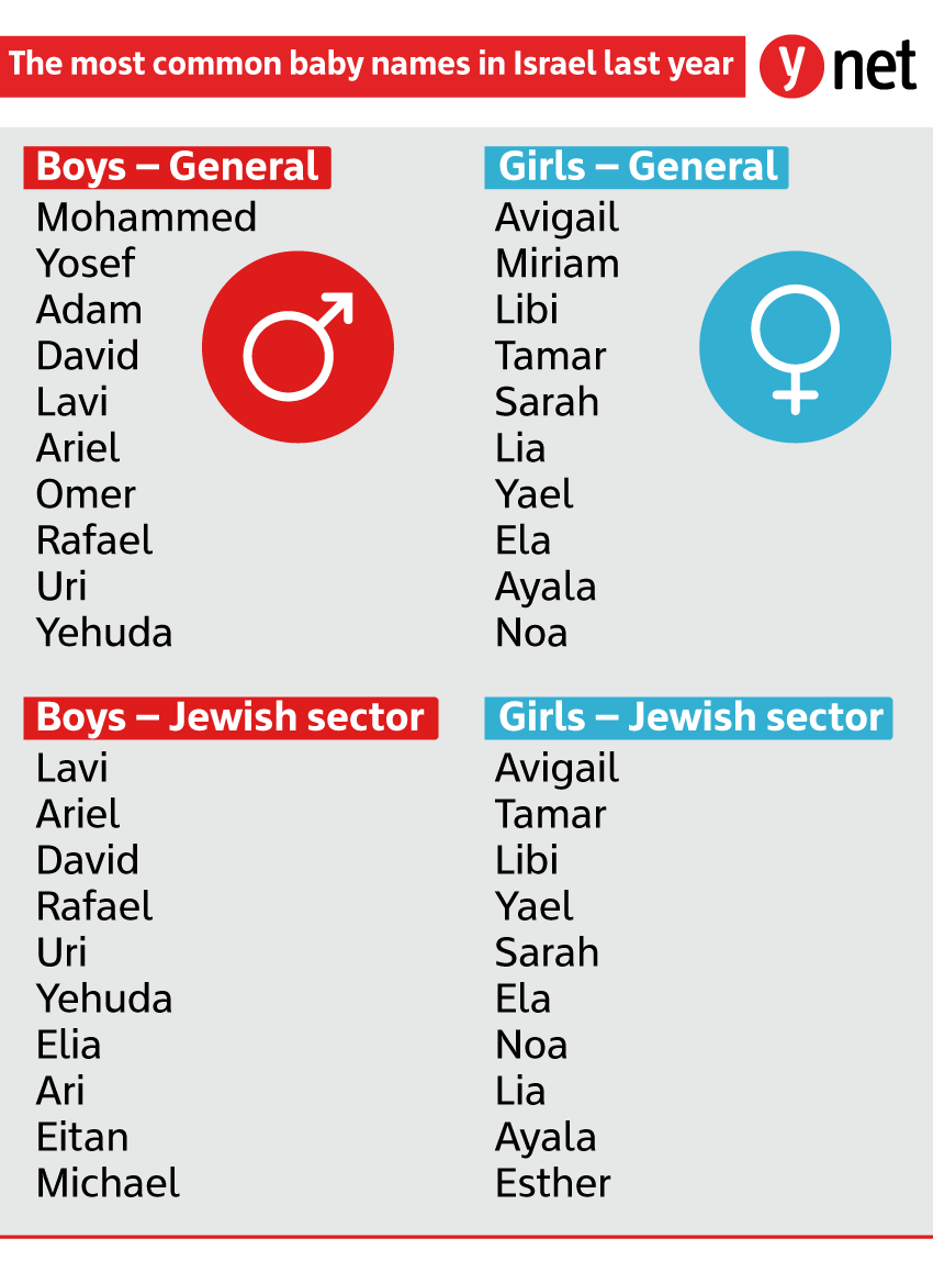 For girls, the most popular name in Israel overall is Avigail, across all sectors. In second place nationwide is Miriam, while among Jews, Tamar takes that spot. Rounding out the top five are Libi, Tamar and Sarah nationwide, while in the Jewish sector, Yael replaces Miriam in the top five.
