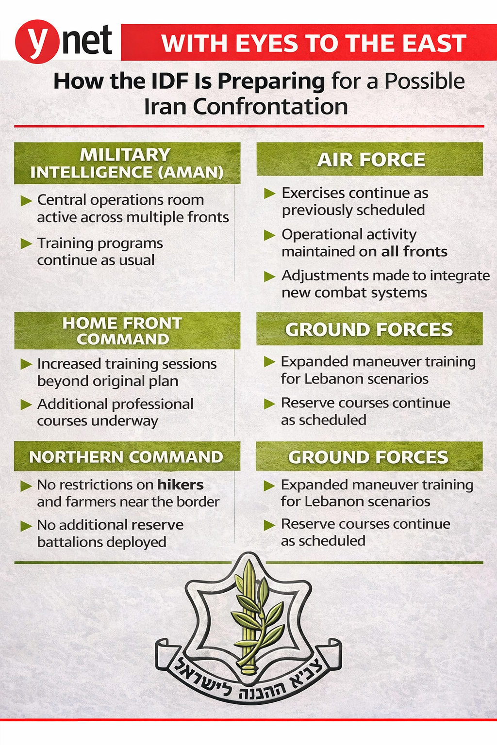 In many units within these branches, as across much of the military, soldiers are still permitted to travel abroad on leave unless they serve in critical roles. The Air Force is maintaining its preplanned training schedule and exercises, alongside ongoing operational activity from Lebanon to Gaza.