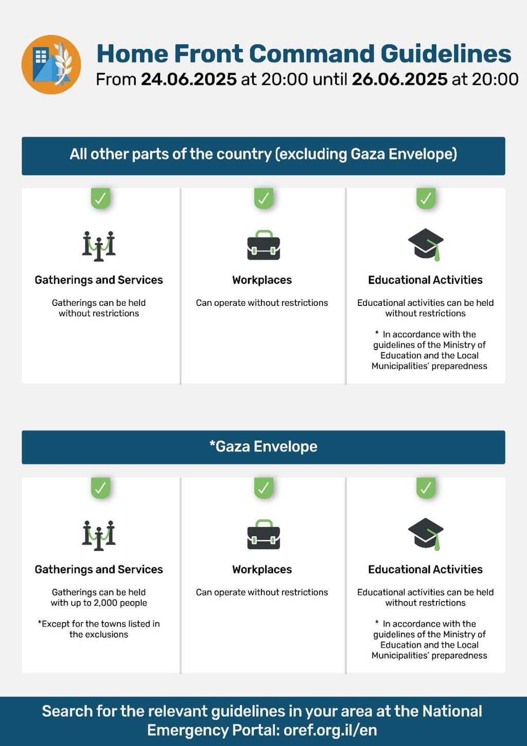 The Home Front Command announced Tuesday evening, after the ceasefire with Iran came into effect, the cancellation of all restrictions imposed since the start of Operation Rising Lion about two weeks ago. At the same time, the special situation on the home front is still in effect, having been extended by government decision until next Monday.