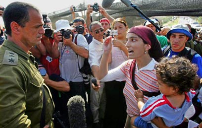 Earlier, forces encountered stiff resistance at Gush Katif’s “capital,” Neve Dekalim, were hundreds of settlers gathered at the closed entry gate. Troops eventually made their way into the community through the industrial, but the sides later agreed that no notices will be handed out. The protesters, meanwhile, agreed to clear the access road to the community, which they blocked earlier.