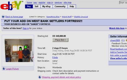 Practical joke or business venture? A young settler couple from the northern West Bank settlement of Sa-Nur, slated for evacuation Tuesday as part of the pullout plan, have posted a message on eBay offering advertising space on an old British police fortress set to become the center of the anti-evacuation struggle.