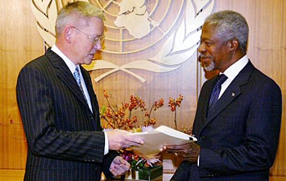 Mehlis Detlev presents copy of report to Kofi Annan (Photo: Reuters)