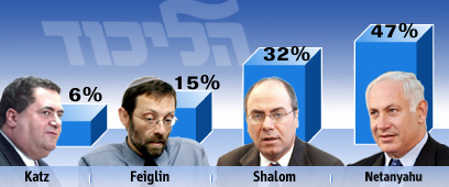 According to an earlier Israel Radio exit poll, Netanyahu received 47 percent of the Likud primaries vote, with Foreign Minister Silvan Shalom coming in second place with 32 percent. Moshe Feiglin received 15 percent of the vote, and Agriculture Minister Yisrael Katz won six percent, according to the poll.