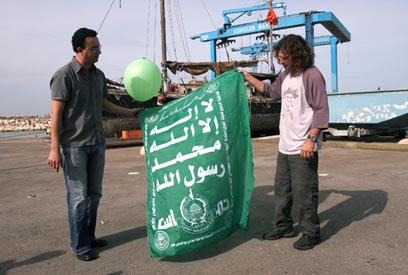 Hamas campaign crosses borders: Two helium balloons carrying Hamas flags and the movement's slogans have drifted to sea and reached the shores of the southern town of Ashkelon Sunday.