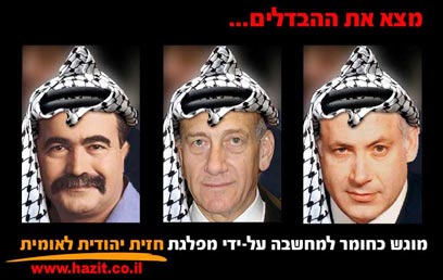 Members of National Jewish Front party distribute leaflets across country with pictures of Olmert, Peretz, Netanyahu wearing square cotton headkerchiefs, usually worn by Arabs; headline reads, ‘Find the differences'