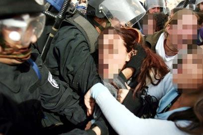 Another girl who was standing on the roof of one of the structures in Amona while police officers stormed it told Ynet: "They started to push us into a corner while beating us, and aiming their blows to intimate body parts, such as the chest and below."