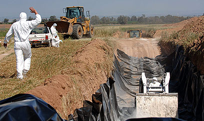 Officials at Ein HaShlosha and Holit began Saturday morning the process of mass killings of chickens through the use of poison in their drinking water. Agriculture Ministry officials arrived at the communities, dug giant pits used to bury the dead birds, and began poisoning them.