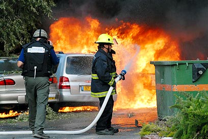 Firefighters tackle blaze after Hizbullah rocket attack on Haifa (Photo: Doron Golan)