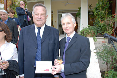 British Ambassador Tom Phillips (R) awards businessman Dov Lautman (Photo: Shlomo Bolkovitch)