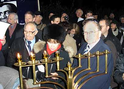 The fourth candle on the menorah was lit by Ben Alfgott, a survivor of the Sobibor death camp, who was invited to light the candle in front of the Iranian embassy as a protest to the nation's recent Holocaust denial conference.A short while after the start of the ceremony, dozens of Hizbullah supporters tried to disrupt it, protesting against Israel with the aid of a loudspeaker.