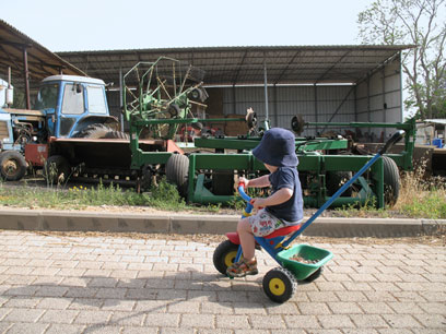 The kibbutz I grew up in managed to maintain its cooperative character so I figured it would be a perfect example for Martin to see. Unlike other kibbutzim that have been privatized and now resemble every other alienated suburb (except for the numbered stickers on the residents' clothes), in my kibbutz, they still have communal dining, a dairy barn and all children still live together in one house.