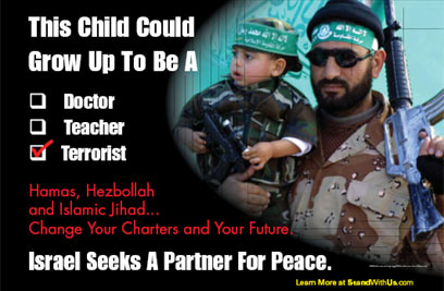 Describing the ETO posters as "deceptive and emotionally manipulative," SWU's International Director, Roz Rothstein, said: "Israel is not fighting children. It is defending itself against extremists like Hamas, Hezbollah and Islamic Jihad whose charters call for Israel's obliteration and whose terrorist attacks target civilians, including school children and toddlers."