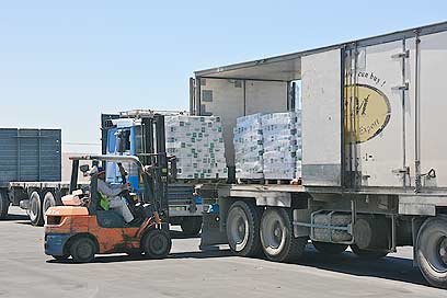 Goods transfered from an Israeli truck to a Palestinian one at Kerem Shalom (Photo: Courtesy of www.imagesofisrael.com)