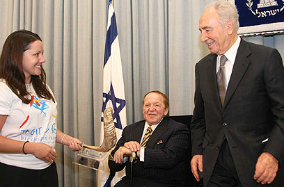 From Left to right: Taglit rep, Sheldon Adleson, Shimon Peres (Photo: Sivan Farag)