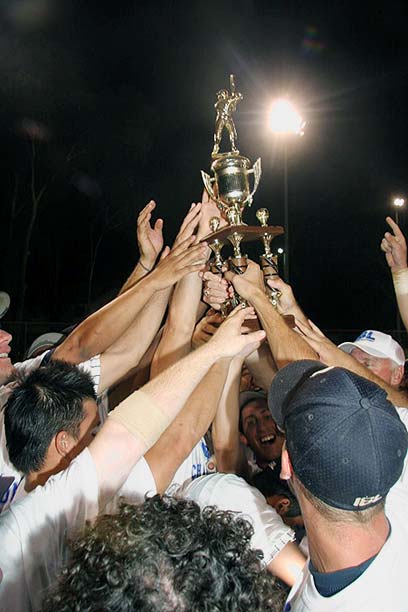 Blue Sox players with trophy (Photo: Yechiel Jonathan Stein)