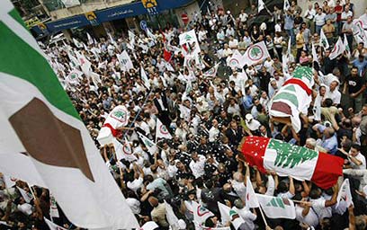 Thousands march in Beirut streets in mass funeral for Phalange Party member Antoine Ghanem. Lebanese government supporters accuse Syria of assassination