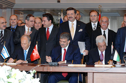 Palestinian, Israeli presidents, along with Turkish counterpart Abdullah Gul, sign deal for establishment of industrial parks in West Bank to provide 5,000 new jobs for Palestinians. Abbas promises peace if Israel ends occupation