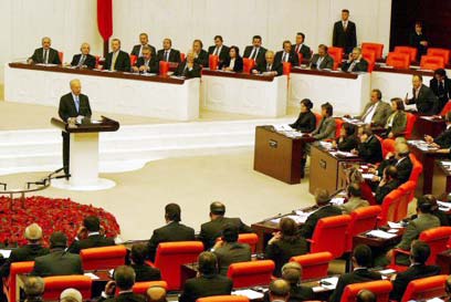 In first-ever speech by Israeli leader before Turkish Parliament, president says, 'I am here to examine the chances for peace in the entire region, from Syria to Yemen.' Complimenting Ankara over its part in the Annapolis peace conference, Peres notes, 'This is a historic opportunity which must not turn into a historic failure'
