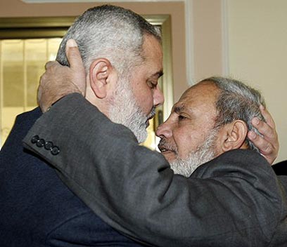 Haniyeh and al-Zahar embracing (Photo: Reuters)