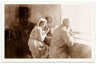7. "In my laboratory in Beersheba with Mrs. Dr. Hegler and Dr. Bader." (This is the only photograph pointing to the name of the album's owner, indicating that he was a member of the medical team)