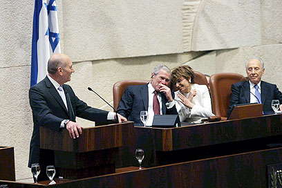 Bush with Olmert, Itzik and Peres (Photo: Alex Kolomoisky)