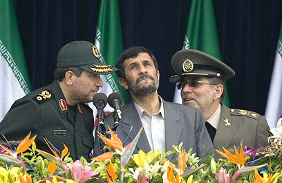 Looking out for Hamas. Iranian President Mahmoud Ahmadinejad (M) and his military chiefs (Photo: Reuters)