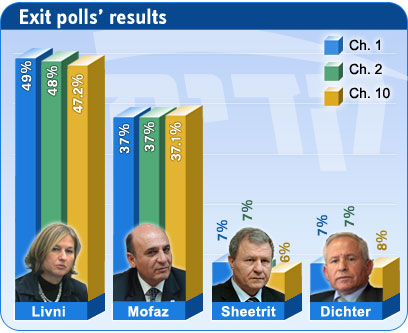 According to Channel 2's exit poll, Livni won 48% of the vote, while Mofaz won 37%. Avi Dichter and Meir Sheetrit were tied at 7% each. According to Channel 10, Livni won 49% of the vote and Mofaz garnered 37%. Sheetrit and Dichter were tied at 7% in this poll as well. Meanwhile, Channel 1 predicted that Livni won 47% of the vote, compared to Mofaz's 37%