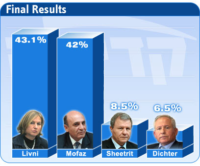 According to the final results, Livni defeated rival Mofaz by a narrow margin of 1.1% of the vote. According to the final results released by Kadima, Livni won the election with 43.1% (16,936 votes). Mofaz came in a close second with 42% (16,505 votes).
