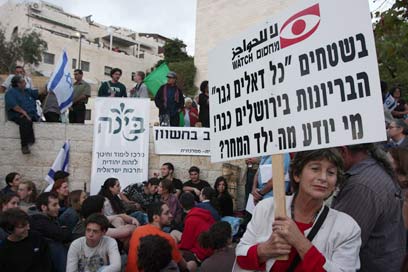 Demonstrators outside Sternhell's home (Photo: Gil Yohanan)