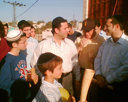 Abraham with settlers at disputed house (Photo: Efrat Weiss)
